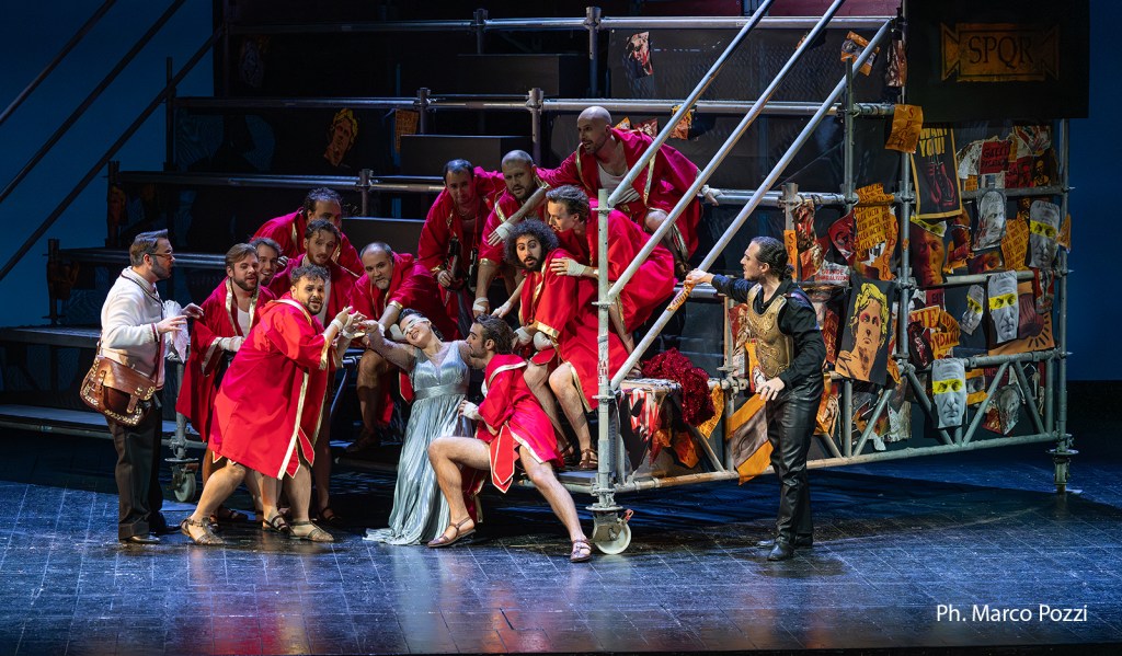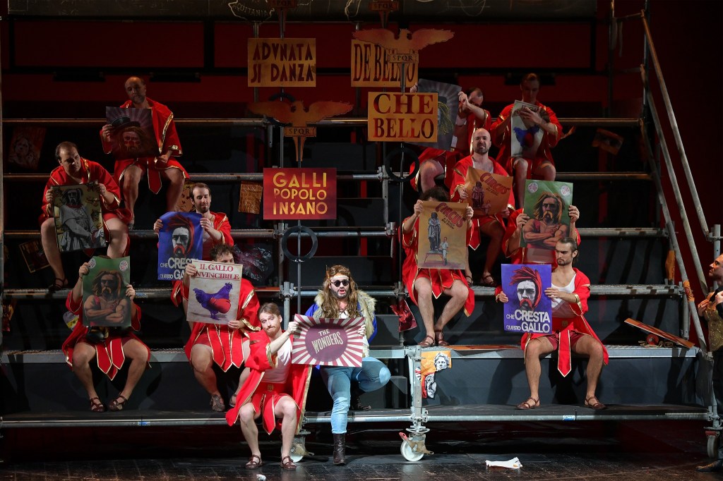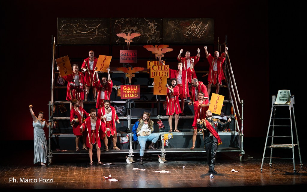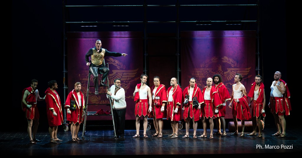 “Buona la sinergia anche tra gli autori e il regista, Tommaso Franchin, che ha cavalcato il tono leggero e giocoso, pur nella narrazione di avvenimenti sanguinosi, suggerito dal libretto e dalla musica: la guerra come un match di pugilato, il dittatore e i suoi legionari come dei campioni sul ring in guantoni e accappatoio, e la scena come una tribuna girevole tappezzata di manifesti e volantini da cui assistere alla sfida; Cesare seduto in alto, su una sedia da arbitro, a decidere sui destini umani.”