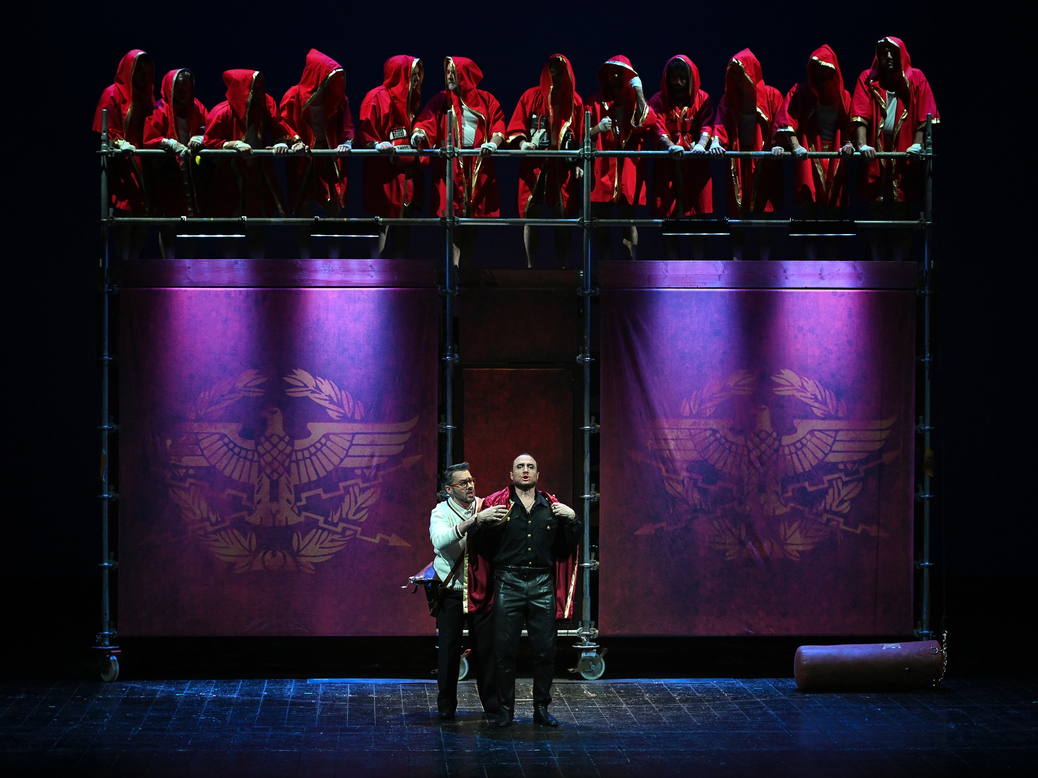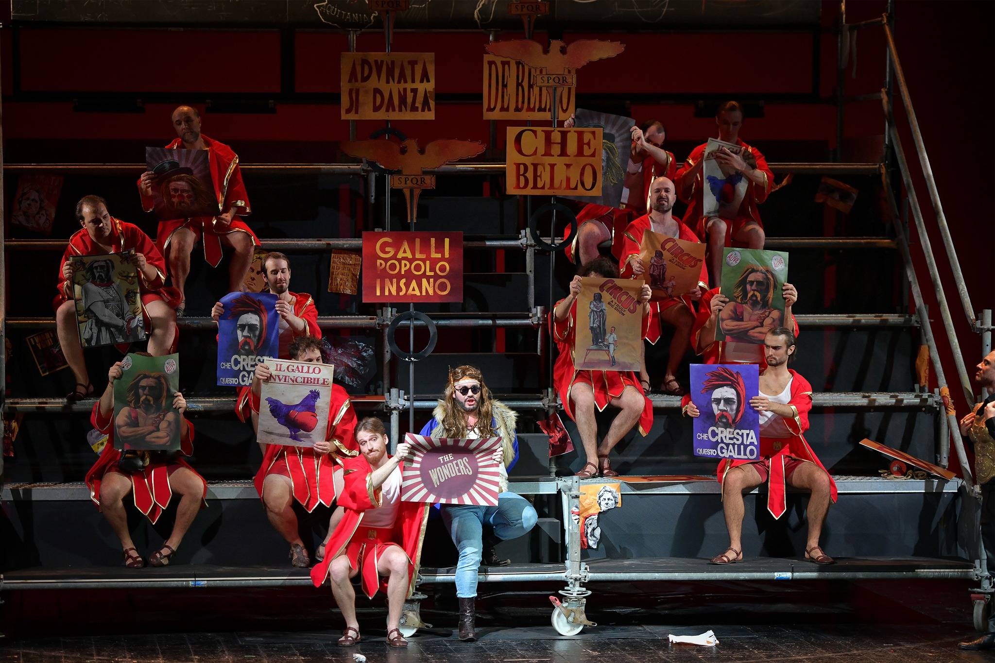 “Buona la sinergia anche tra gli autori e il regista, Tommaso Franchin, che ha cavalcato il tono leggero e giocoso, pur nella narrazione di avvenimenti sanguinosi, suggerito dal libretto e dalla musica: la guerra come un match di pugilato, il dittatore e i suoi legionari come dei campioni sul ring in guantoni e accappatoio, e la scena come una tribuna girevole tappezzata di manifesti e volantini da cui assistere alla sfida; Cesare seduto in alto, su una sedia da arbitro, a decidere sui destini umani.”